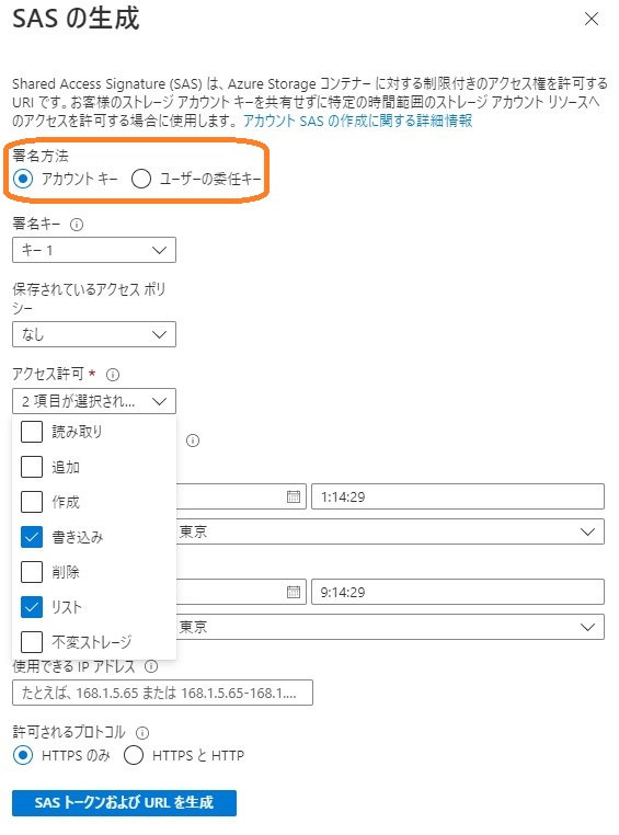 まず、SASを生成する時に、アカウントキーか、ユーザーの委任キーかで挙動が異なります。